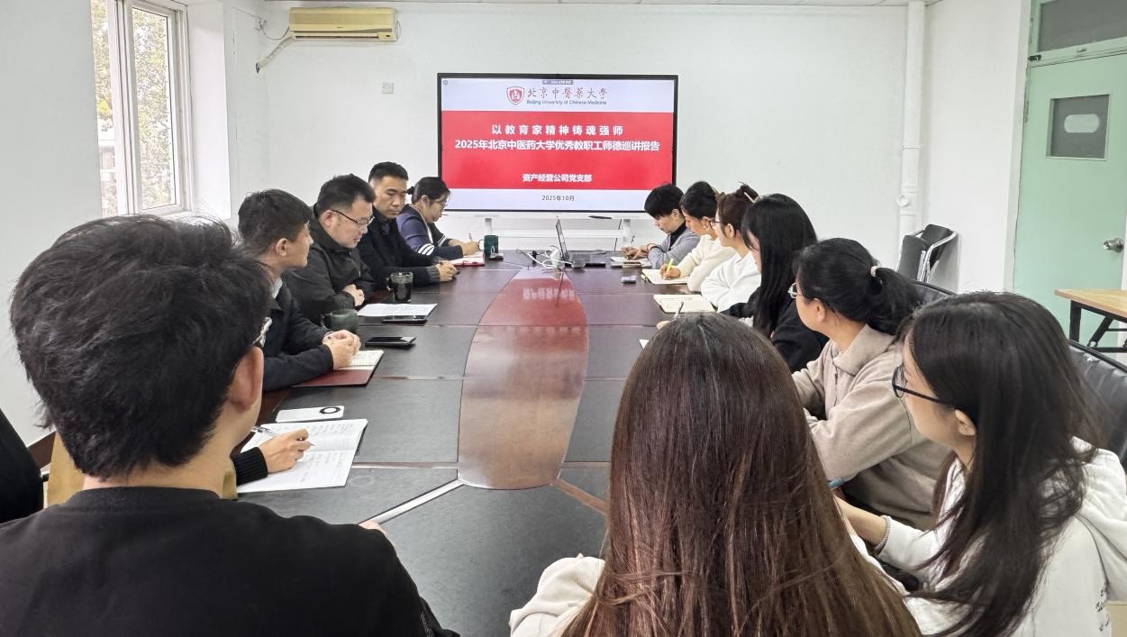 10月31日上午,资产经营公司党支部组织召开“2025年北京中医药大学优秀教职工师德巡讲报告会”。以贯彻落实习近平新时代中国特色社会主义思想为指引,以教育家精神铸魂强师为核心,大力弘扬尊师重教传统,特别邀请学校聘任的北京荣顺和保安服务有限公司良乡校区保安队杨波波队长作专题分享。资产公司全体职工参会,党支部书记高雪松主持报告会。