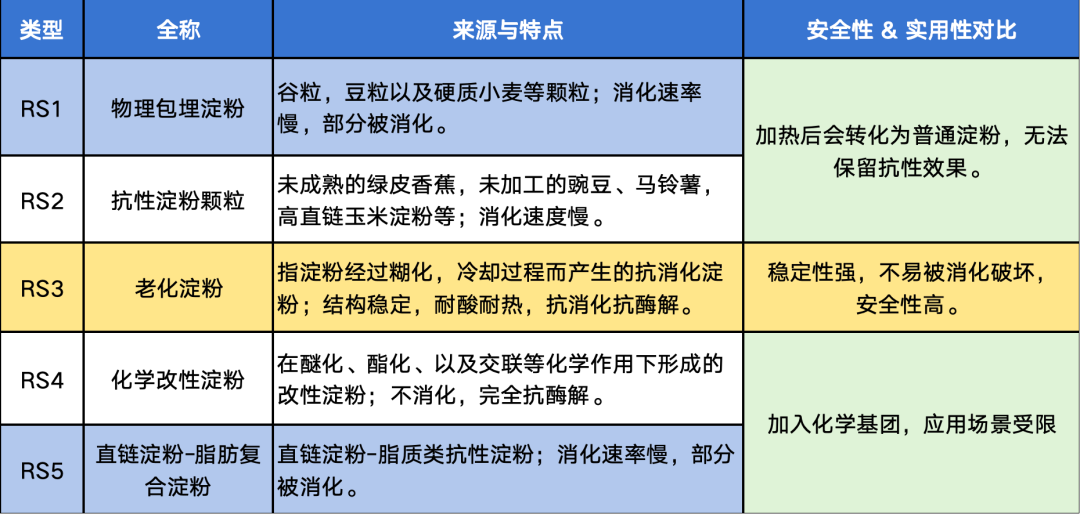 抗性淀粉根据来源和结构,共分为 5 类,我们可以通过表格清晰对比它们的特点与差异: